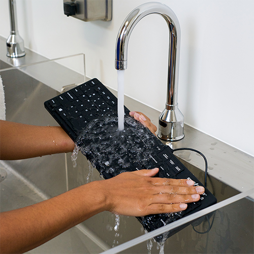 Seal Silk Pro™ Keyboard – Full Size – Washable & Waterproof – IP68-certified – Compatible with industrial-grade cleaners & disinfectants – Quick Connect w/6ft Extension Cable – Assembled and sealed with a latex-free silicone cover – Black – US-English SKU: SK104
