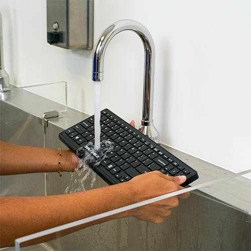 Cleanwipe™ Pro Waterproof Keyboard – Compact Footprint. Washable, waterproof & dishwasher-safe. IPx8-certified. Compatible with industrial-grade cleaners & disinfectants. Three Ergonomic Tilt Positions. Two choices of Cleanwipe Pro latex-free silicone covers are available for purchase. (Black).