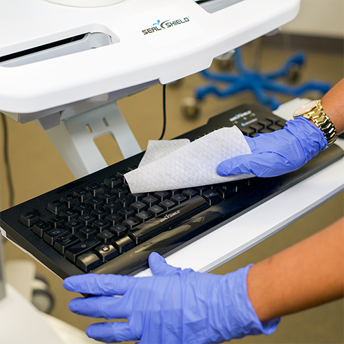 Seal Clean waterproof and backlit keyboards have a standard keyboard design with an IP rating that is IPx8-certified. Keyboards are 100% waterproof, fully submersible and stand up to industrial-grade disinfectants. Backlit keys provide visibility in darker settings. The standard style ABS plastic construction provides a true type tactile feel for smooth and comfortable typing. It is a wired keyboard that features a quick connect USB cable with RF shielding for convenient plug-and-play and a Seal Cap™ for USB protection during cleaning. Full-Size numeric keypad and laser-etched keycaps enhance durability and product longevity throughout regular and vigorous cleaning. These keyboards are available in both black and white and with a short or long USB cable.