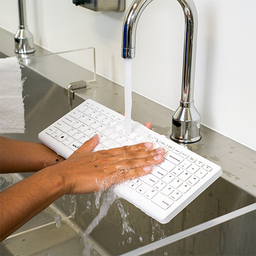 Clean Wipe™ Pro Waterproof Keyboard – Compact Footprint. Washable, waterproof & dishwasher-safe. IPx8-certified. Compatible with industrial-grade cleaners & disinfectants. Three Ergonomic Tilt Positions. Two choices of Cleanwipe Pro latex-free silicone covers are available for purchase. (White).