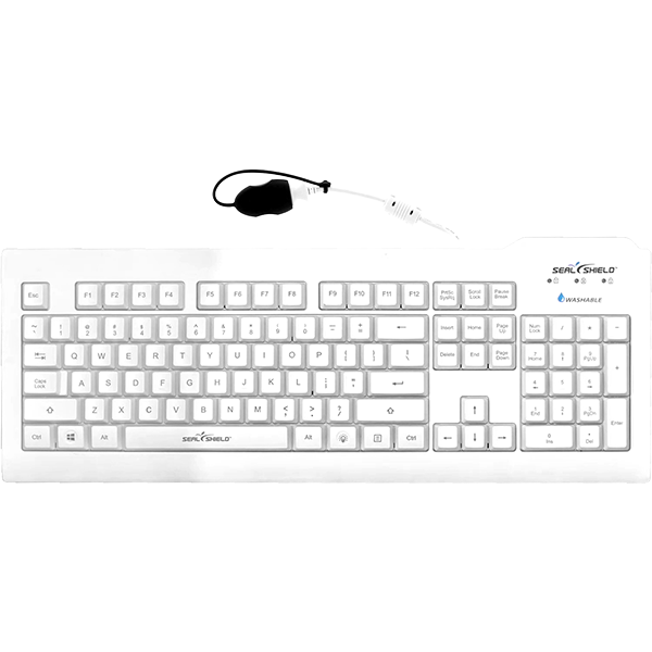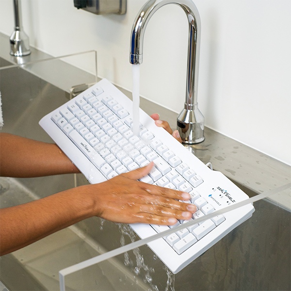 Seal Clean waterproof keyboards have a standard design with an IP rating that is IPx8-certified. Keyboards are 100% waterproof, fully submersible and stand up to industrial-grade disinfectants. The standard style ABS plastic construction provides a true type tactile feel for smooth and comfortable typing. It is a wired keyboard that features a quick connect USB cable with RF shielding for convenient plug-and-play and a Seal Cap™ for USB protection during cleaning. Full-Size numeric keypad and laser-etched keycaps enhance durability and product longevity throughout regular and vigorous cleaning. Keyboards are available in both black and white.