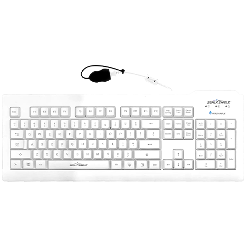 Seal Clean Glow™ Backlit Waterproof Keyboard. 100% waterproof & dishwasher-safe keyboard is IPx8-certified and designed to withstand industrial-grade disinfectants & cleaners. True type keyboard with tactile feel and full travel keys for smooth and natural typing. Features a Quick Connect Cable with RF shielding and a Seal Cap™ for easy plug-and-play. Full-Size numeric keypad and Laser-etched keycaps enhance durability and product longevity throughout regular and vigorous cleaning. (White).