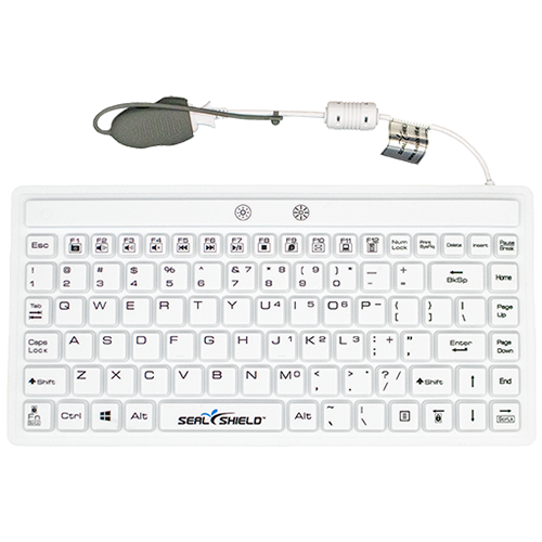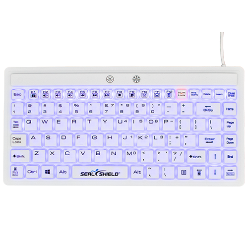 Seal Silk Mini Glow™ Waterproof Backlit Keyboards are 100% waterproof & dishwasher-safe. IP68-certified and designed to withstand industrial-grade disinfectants. Features an ultra compact design, adjustable backlit keys and keylock. (White) (USB)